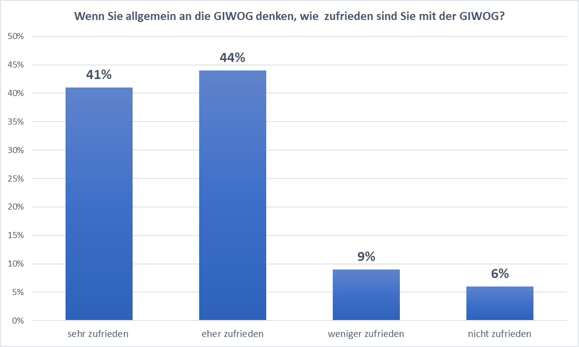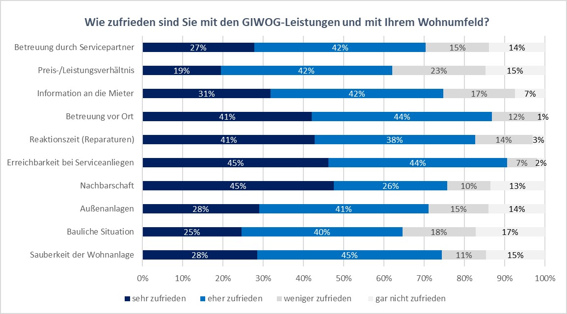 Laut der Befragung sind die Mieterinnen und Mieter besonders zufrieden mit dem Wohnumfeld, das ihnen die GIWOG bietet. Zudem schneidet die GIWOG in den Augen der Bewohnerinnen und Bewohner bei der Sauberkeit der Wohnanlage, der umfassenden Betreuung, der Erreichbarkeit der Mitarbeiterinnen und Mitarbeiter und der kurzen Reaktionszeiten auf Anfragen sehr gut ab.