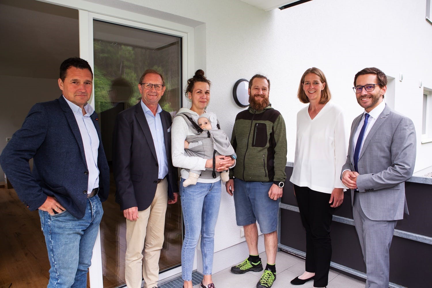 Im Bild von links: Markus Feuersinger (Wohnbau Bergland), Bürgermeister Reinhard Breitfuss (Gemeinde Viehhofen), Veronika und Liber Jancik mit Sohn Johannes (neue Bewohner), Landesrätin Andrea Klambauer (Land Salzburg) Philipp Radlegger (Obmann Wohnbau Bergland) © WOHNBAU BERGLAND