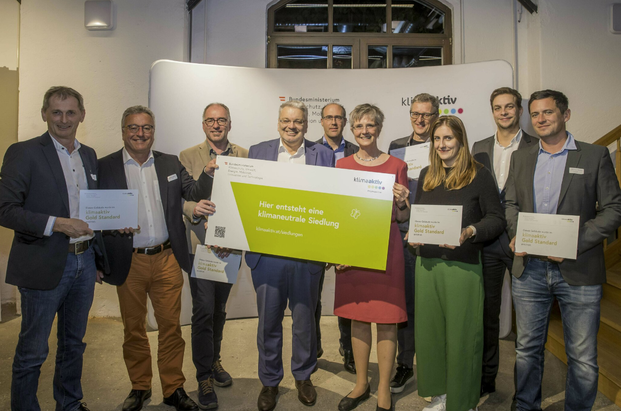 Gleich fünf Mal wurde die Gemeinnützige Salzburger Wohnbaugesellschaft (gswb) vom Bundesministerium für Klimaschutz (BMK) mit der Auszeichnung „klimaaktiv Gold“ prämiert. Alle Gebäude der Siedlung Hallein Burgfried, deren Bauabschnitt 2 dieses Jahr vollendet wurde, erreichten über 900 von 1.000 Punkten und wurden somit aufgrund besonders hoher Energieeffizienz, Umweltfreundlichkeit und diversen zusätzlichen ökologischen Maßnahmen ausgezeichnet.
