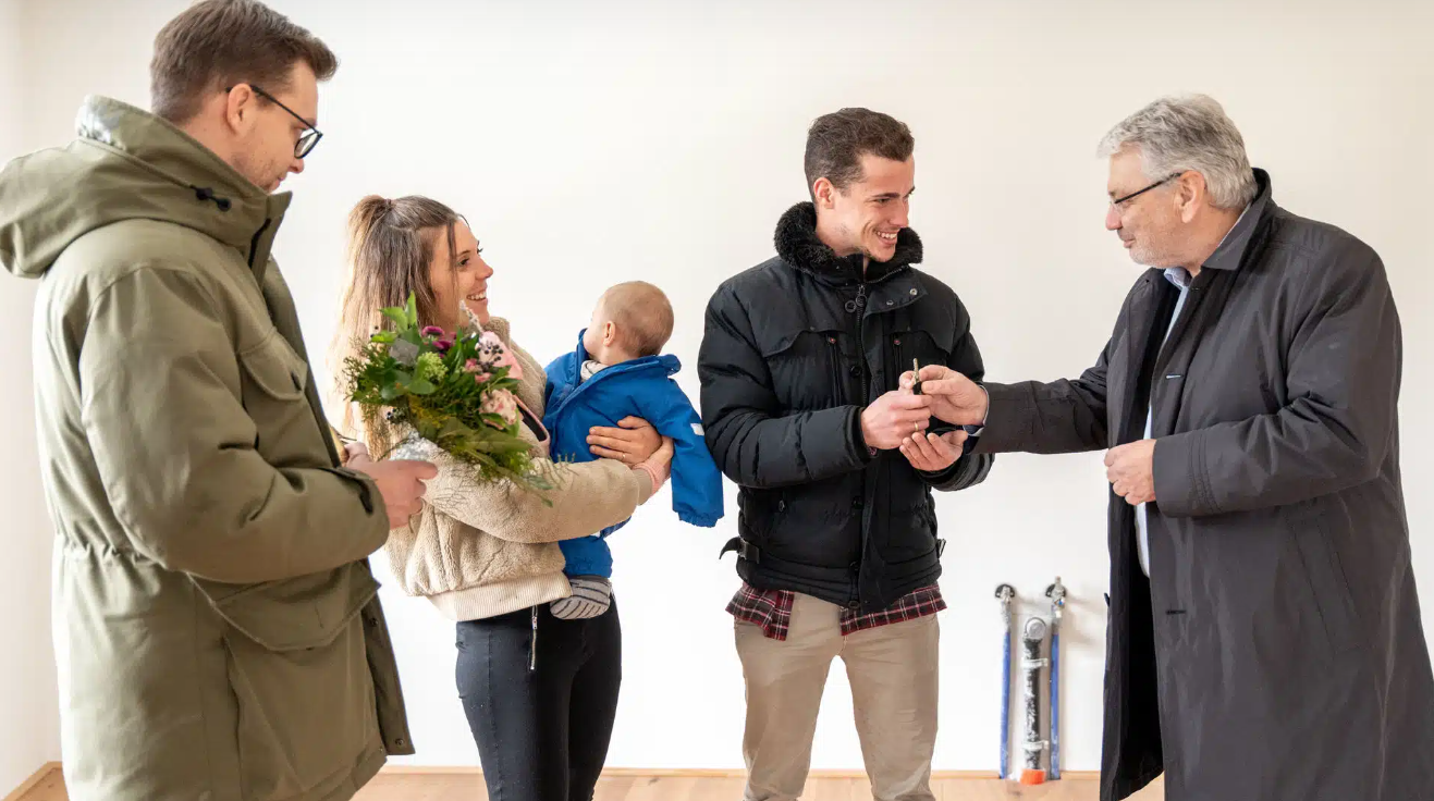 60 Wohnungen wurden übergeben. In eine davon wird diese glückliche Familie einziehen © gswb