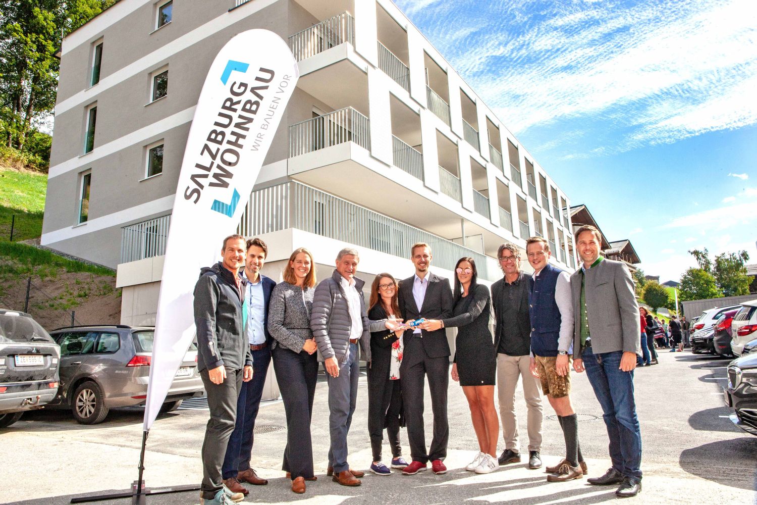 Gefeiert wurde auch die Fertigstellung von insgesamt 50 geförderten Mietwohnungen. In drei Bauetappen errichtete Salzburg Wohnbau zentrumsnah im letzten Bauabschnitt 18 moderne 2- und 3-Zimmerwohnungen für die Einwohnerinnen und Einwohner. Nun wurden die Wohnungen unter anderem mit Wohnbau-Landesrätin Andrea Klambauer übergeben:
