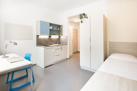Um den Ansprüchen zeitgemäßen Wohnens gerecht zu werden, wurde im Zuge der Sanierung das Gebäude im Salzburger Andräviertel bis auf die Tragstruktur rückgebaut und die Raumaufteilung neu strukturiert. Auch wenn es dabei zu einer Reduzierung des Zimmerbestandes kam, sind nun nach der Sanierung des im Jahr 1963 errichteten Objektes, in jedem Zimmer eine eigene Sanitäranlage und Küchenzeile vorhanden. Neben den „eigenen vier Wänden“ stehen den Bewohnerinnen und Bewohnern im Gebäude mehrere Musikzimmer sowie ein großer Gemeinschaftsraum zur Verfügung.