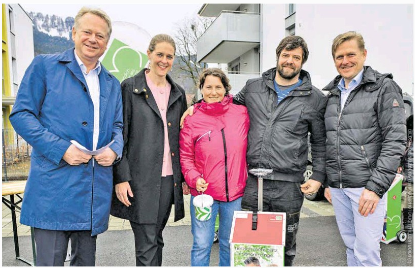Direktor „die salzburg“ Markus Sturm (1. v.l.), LR Andrea Klambauer (2. v.l.) und Bürgermeister Thomas Freylinger (1.v.r.) freuen sich die neuen Bewohnerinnen und Bewohner willkommen zu heißen. ©die salzburg