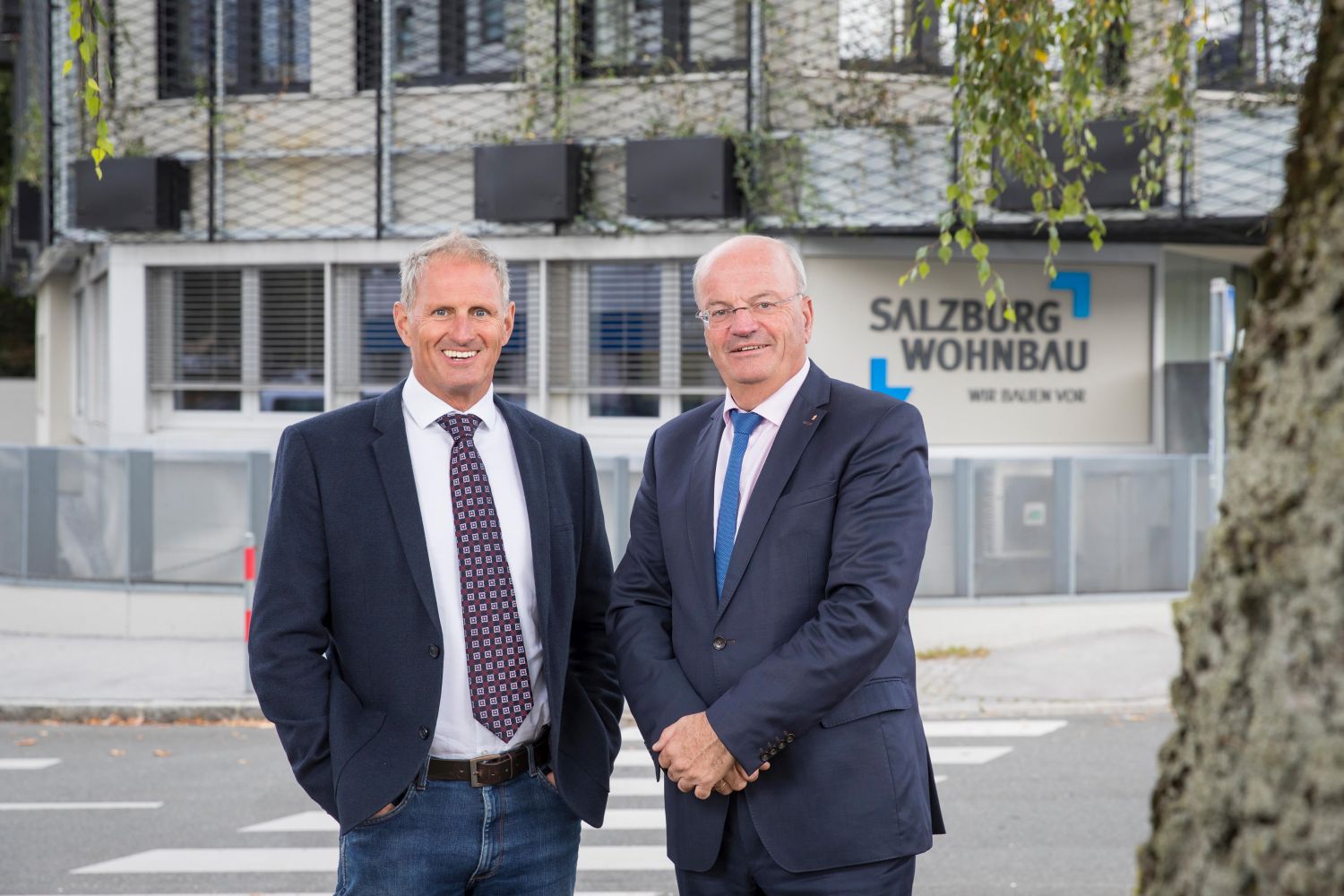 Die beiden Salzburg Wohnbau-Geschäftsführer Roland Wernik (li.) und Christian Struber wollen die digitale Kommunikation im Unternehmen weiter vorantreiben. ©Neumayr