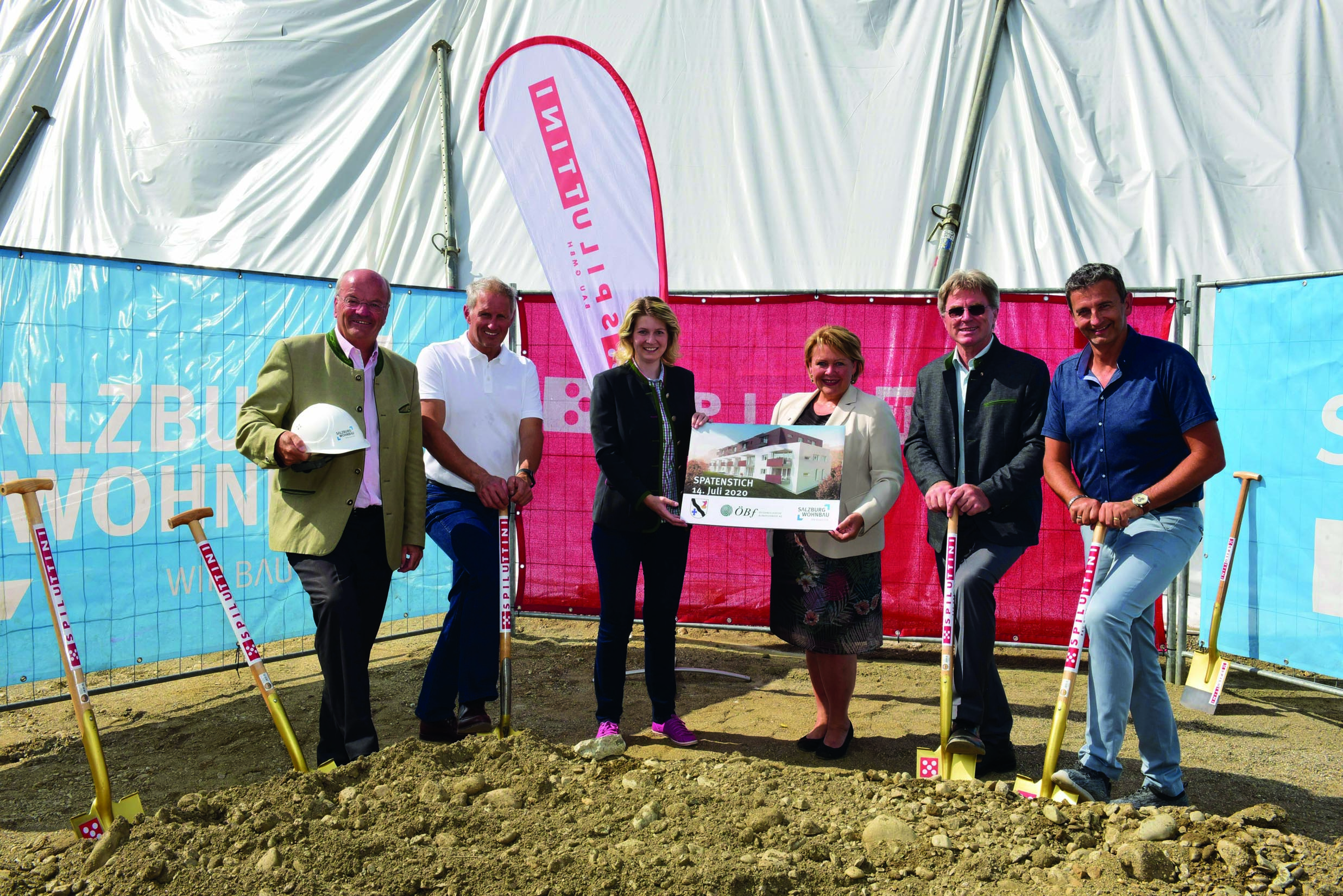 Beim Spatenstich für weitere 28 Wohnungen in der Schönbergsiedlung. (v.l.n.r.) Die beiden Salzburg Wohnbau-Geschäftsführer Christian Struber und Roland Wernik, LAbg. Elisabeth Huber, NR Gertraud Salzmann, LAbg. Josef Egger und Bürgermeister Andreas Haitzer. © Hannes Kirchberger