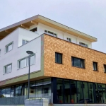 Der Neubau im Herzen der Marktgemeinde Kaprun besticht mit seinem markanten Baustil: Die hervorgehobenen Obergeschosse stechen optisch direkt ins Auge. Das Multifunktionalgebäude wurde in modernem Stil mit begrüntem Flachdach errichtet. Kombiniert wurde dies mit einem traditionell ortsüblichen Element: einer vorstehenden Fassade aus Lärchenschindeln. So schafft der Bau eine perfekte Verbindung aus bekannten und neuen Elementen.{cwgallery}