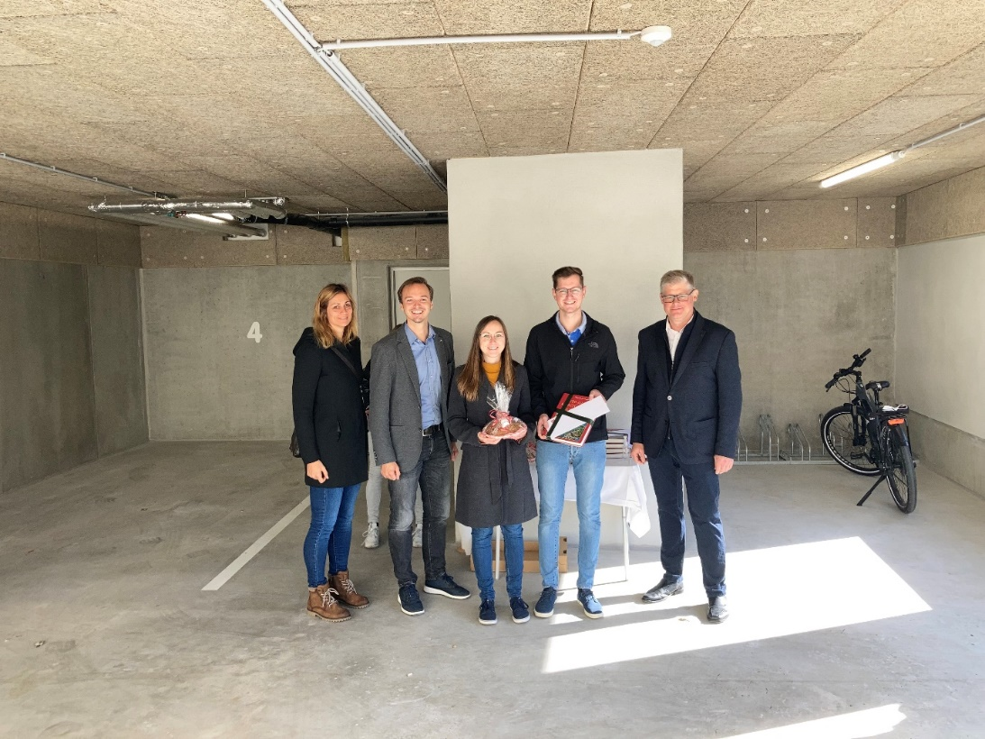 Bürgermeister Johannes Wagner, Micha Nietsch und die neuen Bewohnerinnen und Bewohner bei der feierlichen Übergabe der neuen Wohnungen. © Frohnleitner