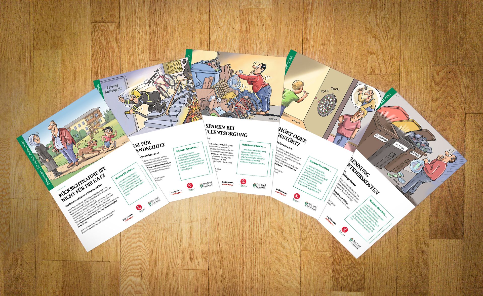„Aufgrund des Formates und ihrer Praktikabilität werden unsere Folder vor allem als Beilage in Briefaussendungen und Informationsmappen genutzt oder auch einfach persönlich mitgegeben“, so Christina Trattner vom Servicebüro zusammen>wohnen. Aufgrund erhöhter Nachfrage hat man sich nun entschlossen, die Inhalte der Folder in komprimierter Form auch auf Postern darzustellen. „Das A4-Format lässt sich gut in Wohnanlagen aushängen“, begründet Trattner die Entscheidung: „Wir hoffen, dass die Poster mit unseren Karikaturen die Bewohnerinnen und Bewohner dazu animieren, kurz stehen zu bleiben und einen genaueren Blick auf die Inhalte zu werfen.“