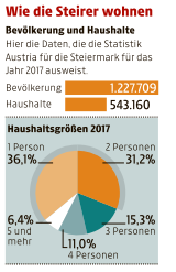 In der Steiermark ist die Anzahl der Haushalte zwischen 1961 und 2017 um 63 Prozent gestiegen, obwohl das Bevölkerungswachstum in demselben Zeitraum lediglich 8 Prozent betrug. Zurückzuführen ist das auf die Einpersonenhaushalte, die sich in den letzten 56 Jahren verdreifacht haben. Die Zweipersonenhaushalte haben sich mehr als verdoppelt, die Dreipersonenhaushalte sind um ein Fünftel gestiegen. Vierpersonenhaushalte haben hingegen nur um 6 Prozent zugelegt, Haushalte mit fünf oder sechs Personen sind mehr als 55 Prozent zurückgegangen. Prognosen für das Jahr 2050 gehen davon aus, dass Einzelpersonenhaushalte auch in Zukunft wachsen werden und bis zu zwei Fünftel aller Haushalte ausmachen werden. Dieser Trend wirkte sich auch auf die Größe der Wohneinheiten aus – in den vergangenen 56 Jahren verringerte sich die durchschnittliche Wohnungsgröße in der Steiermark um ein Drittel, während der Rückgang österreichweit mehr als ein Viertel ausmachte.
