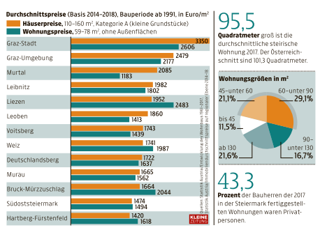 Die Hälfte aller 2017 fertiggestellten Wohnungen sind zwischen 45 und 90m2 groß - im Durchschnitt ergibt sich für die steirische Wohnung eine Größe von 95m2. Damit liegt das Bundesland im Österreich-Ranking an drittletzter Stelle – der Österreich-Schnitt beträgt 101,3m2. Der Großteil der in der Steiermark fertiggestellten Wohnungen geht in Eigentum über – die Wohnungserrichtung liegt dabei großteils in privater Hand. Aufgrund einer Haushaltsprognose aus dem Jahr 2018 der Landesstatistik gehen Experten davon aus, dass im Jahr 2050 in zwei von fünf steirischen Haushalten nur noch eine Person leben wird, was für den Wohnbau mehr Bedarf an kleineren Einheiten bedeutet.