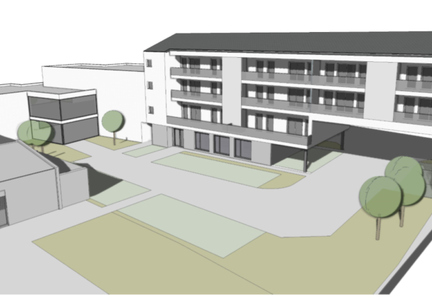 Der Neubau am Areal der ehemaligen Molkerei bringt 16 neue Wohnungen direkt im Zentrum. © Brucker Wohnbau