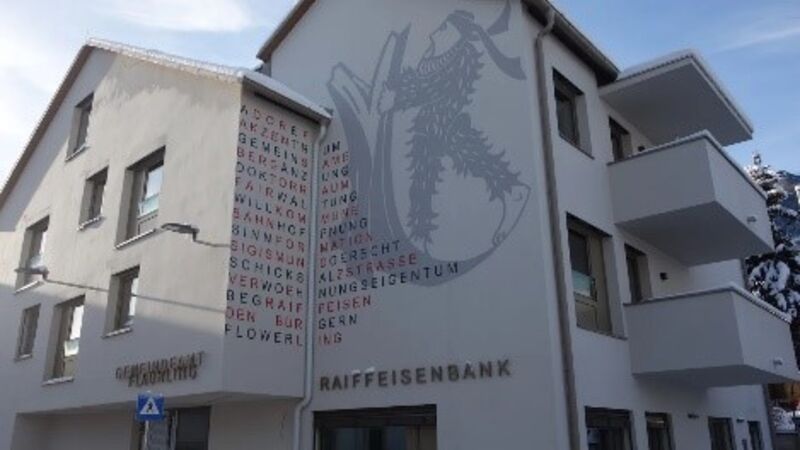 Neben der multifunktionalen Nutzung des Gebäudes und dem zugehörigen Car-Sharing Projekts fällt der Neubau Passantinnen und Passanten vor allem durch die kunstvolle Gestaltung der Fassade sofort ins Auge: Im Rahmen eines „Kunst am Bau“-Projektes wurde die Vorderseite des Gebäudes im Zentrum der Gemeinde im Tiroler Oberland mit dorfbezogenen Sprachexperimenten und einem Gemeindewappen des Wortkünstlers Wilfried Schatz gestaltet. Zu sehen sind neben bunten regionalen Begriffen auch der Flaurlinger Geistliche und Bibliotheksstifter Sigmund Ris, von welchem sich auch das Gemeindewappen abgebildet wird.