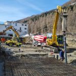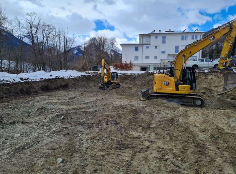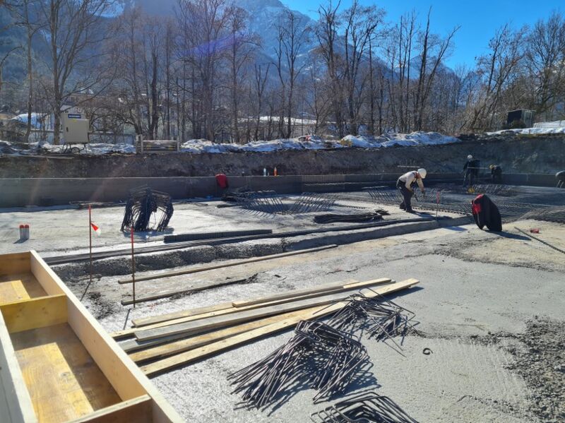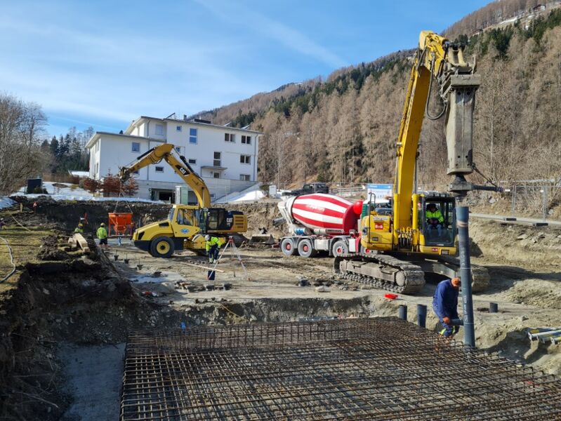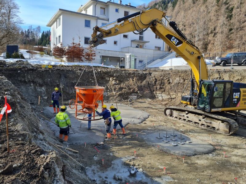 Um die Fundamenttiefe zu erreichen, wird das Erdreich nun bis zu 4 m abgetragen. Anschließend wird auf diesem Niveau die Bodenplatte betoniert – das erfolgt in insgesamt vier Abschnitten. Aufgrund der Lage des neuen Wohnbauprojekts nahe der Ruetz kommen zusätzlich Duktilpfähle zum Einsatz. Diese werden mehrere Meter in den Boden gerammt und garantieren die Standsicherheit des Gebäudes. Bei den Bauarbeiten gilt also die Devise „Sicher ist sicher“, um einen stabilen Untergrund gewährleisten zu können!