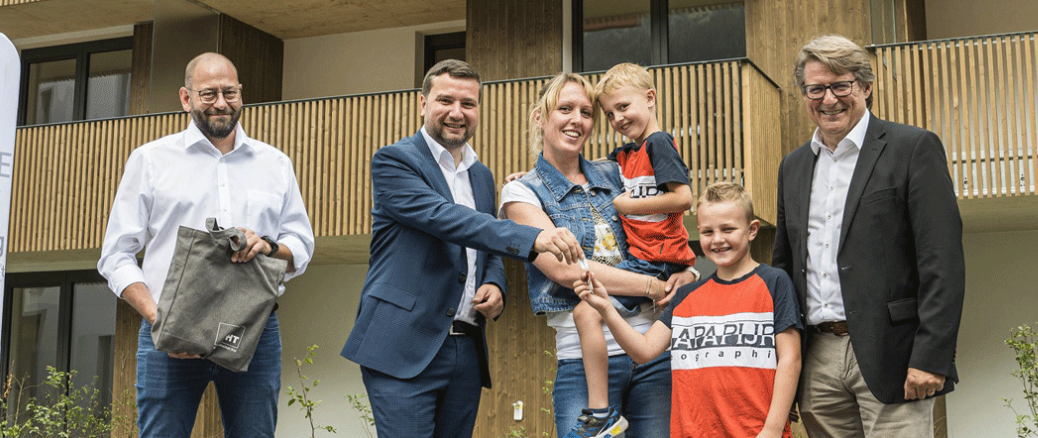 Die Anwesenden begrüßen Kerstin Schaffenrath mit Alexander im neuen Zuhause (v.l.n.r. NHT-Geschäftsführer Hannes Gschwentner, Alexander, Kerstin Schaffenrath, Landtagsvizepräsidentin Sophia Kircher, Bürgermeister Thomas Suitner) © NHT/Vandory
