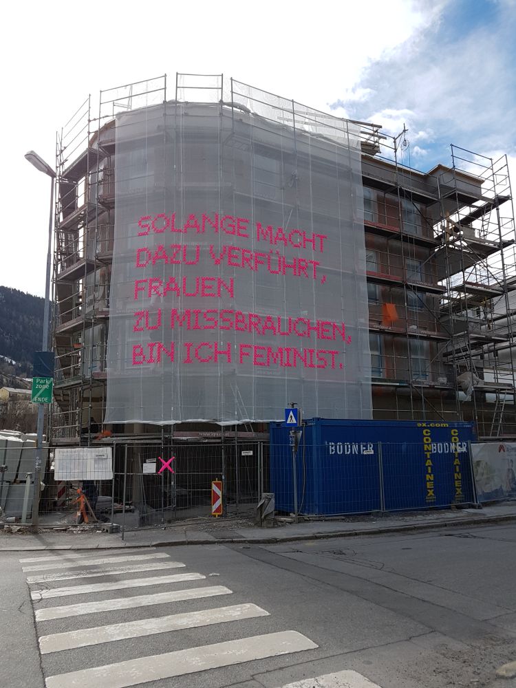Die verhüllte Fassade in der Salzburgerstraße in Wörgl trug die Aussage „Solange Frauenpower als Energiequelle unterbewertet ist, bin ich Feministin." Auch in Landeck stand 2018 das Hinterfragen der vorherrschenden Machtstrukturen im Vordergrund . Das Wohnprojekt in der Schrofensteinstraße signalisierte dies mit der großflächigen Botschaft „Solange Macht dazu führt, Frauen zu missbrauchen, bin ich Feminist."