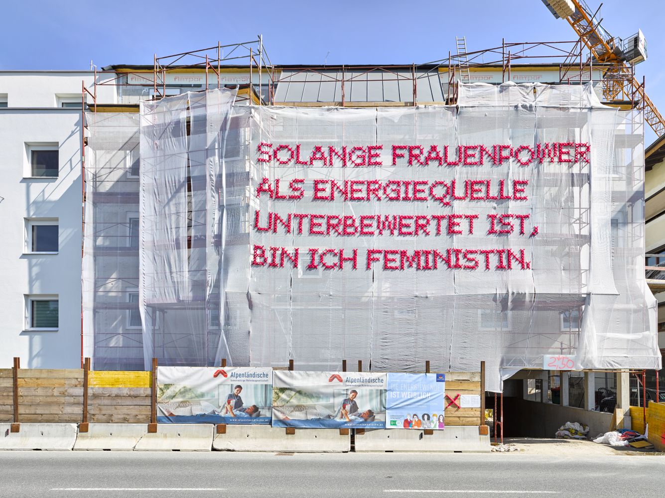 Bereits zum zweiten Mal bot die Alpenländische dem temporären Kunstprojekt von Katharina Cibulka „SOLANGE" und damit auch der gesellschaftlich unterbewerteten „Energiequelle Frauenpower", eine starke Plattform im öffentlichen Raum. Im Rahmen der Informations- und Diskussionsveranstaltungsreihe „Energie Zukunft Tirol" hat der gemeinnützige Verein Energie Tirol, der als unabhängige Beratungsstelle des Landes Tirol fungiert, das Thema „Die Energiewende ist weiblich - Energie Tirol zeigt Frauenpower" aufgegriffen . Dabei wurde auch das Projekt „SOLANGE", der Tiroler Performance- und Mediakünstlerin Katharina Cibulka gefördert. Cibulka nutzte die großen Flächen der Staubschutzplanen, um mittels eingestickter Botschaften feministische Forderungen zu vermitteln. In Kooperation mit Energie Tirol stellte der gemeinnützige Wohnbauträger die Fassadenflächen in Wörgl (2019) und Landeck (2018) für das Projekt „SOLANGE" zur Verfügung.