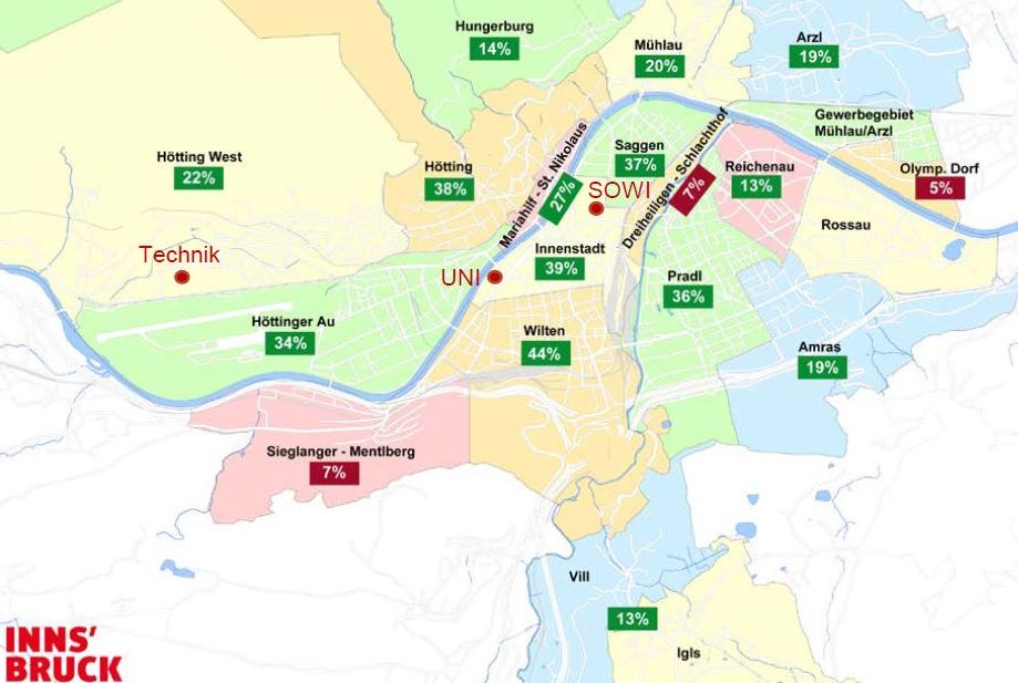 46,5% der Befragten ist die Wohnungslage im Stadtgebiet ziemlich wichtig, 34% sogar sehr wichtig. Als bevorzugtes Stadtgebiet wurde Wilten (43,7%) genannt, gefolgt von der Innenstadt Innsbruck (38,9%) und Hötting (38,2%).