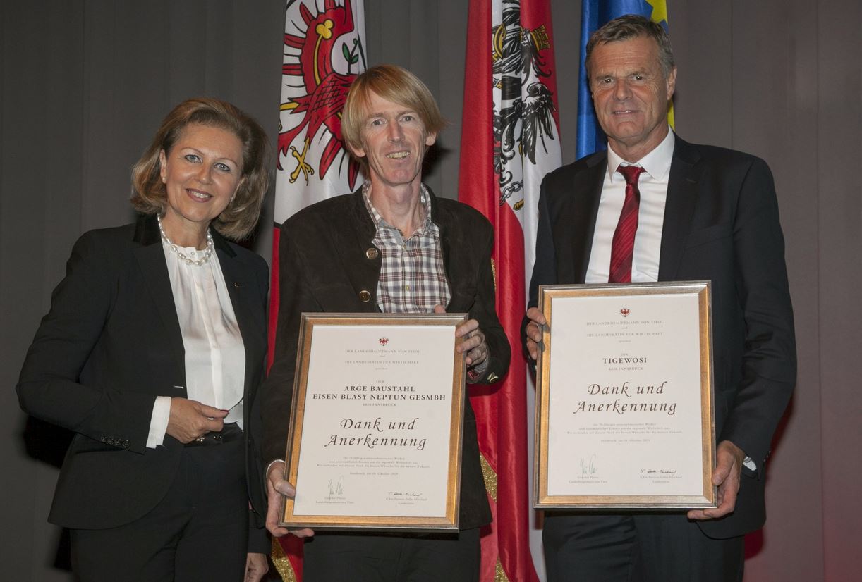 Franz Mariacher, Geschäftsführer TIGEWOSI (im Bild rechts) übernahm die von Wirtschaftslandesrätin Patrizia Zoller-Frischauf überreichte Auszeichnung ©Die Fotografen/ Land Tirol