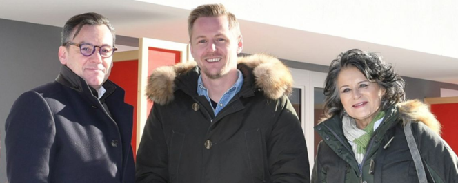 Alles neu am Areal der ehemaligen Südtiroler Siedlung: (v.l.n.r.) NHT-Geschäftsführer Markus Pollo und Bürgermeisterin Hedi Wechner begrüßen Mieter Milan Juranovic im neuen Zuhause. ©NHT/Vandory