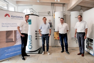 Alpenländische Geschäftsführer Jürgen Steinberger, Inhaber von Ovum & Meco Peter Krimbacher, Ovum & Meco Geschäftsführender Gesellschafter Martin Fischbacher und Alpenländische Geschäftsführer Markus Lechleitner im Schauraum der Firma Ovum & Meco, die Wärmepumpen herstellt. ©ALPENLÄNDISCHE
