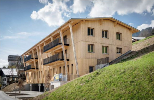 Insgesamt erbaute die VOGEWOSI acht Mietwohnungen und ein Geschäftslokal auf einer Fläche von 545 m2. Zur Auswahl stehen sowohl 2- als auch 3- und 4-Zimmer-Wohnungen. Eine Fassade aus regionalem Holz, genauer zu sein Bergholz, verleiht der Wohnhausanlage eine ganz besondere Optik. So erstrahlt diese in hellem Holz mit dunklen Details durch die schwarzen Stahlgitter der Balkone.