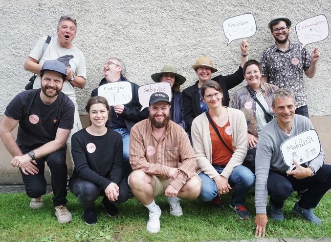 Das Projektteam des ersten Living Labs (Hinten v.l.n.r.: Wolfram Stroppa, Architekt Ernst Rainer, Antonia Hopfner, Gudrund Sturn, Natalie Krieg, Johannes Herburger; Vorne v.l.n.r.: Architekt Matthias Fortenbacher, Laura Bonetti, Jonas Barth, Anna Duschelbauer, Martin Reis) © Alpenländische