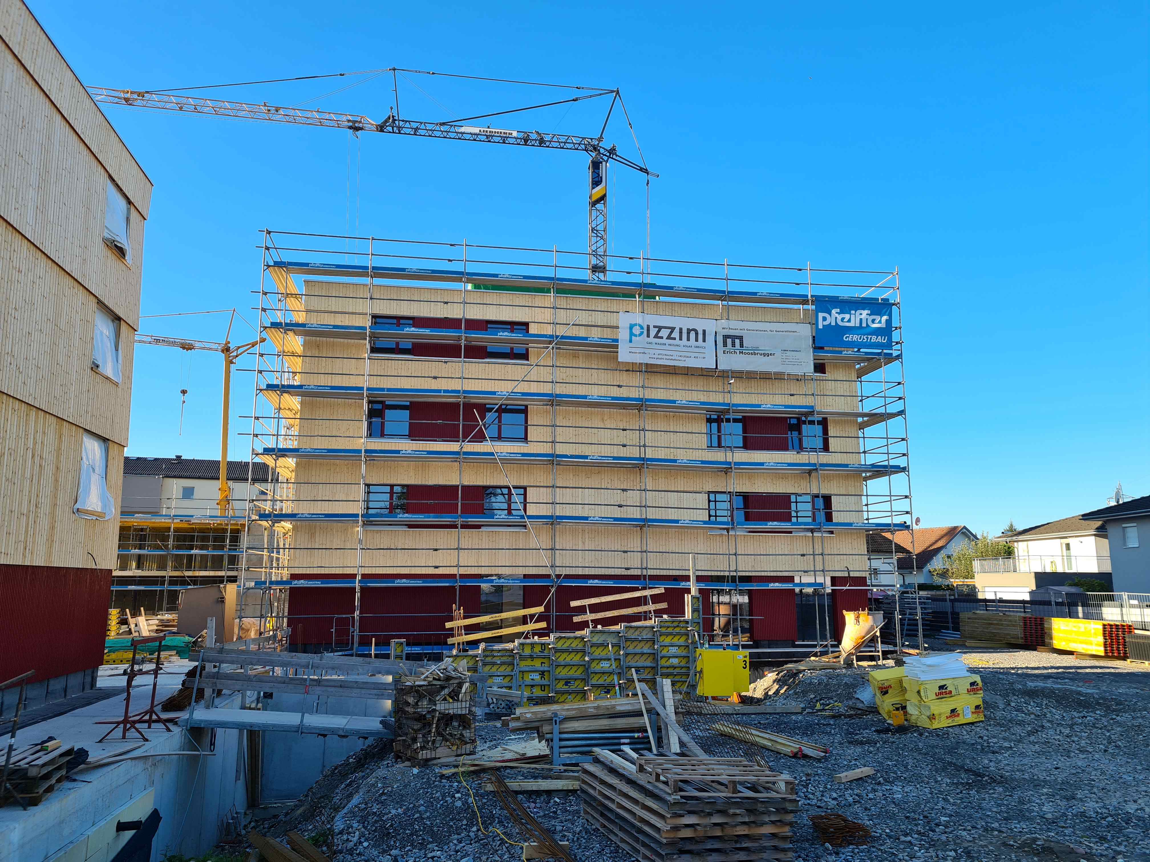 Einen wichtigen Meilenstein gab es bei der Wohnbauselbsthilfe in Lauterach zu feiern. Denn das nachhaltige Wohnprojekt, bei welchem 38 geförderte Wohnungen entstehen, biegt mit Begehung der Dachgleiche auf die Zielgerade ein. Um diesen tollen Moment zu zelebrieren, wurde auf dem Holzhaus traditionsgemäß ein weiteres, temporäres Holzelement angebracht: nämlich der Firstbaum.
