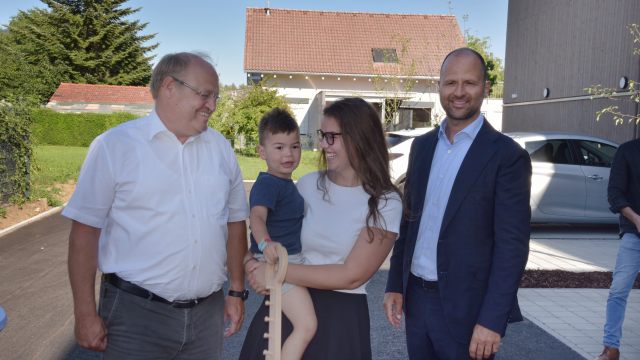 In Anwesenheit von Bürgermeister Elmar Rhomberg und Landesrat Wohnbaureferent Marco Tittler fanden sich die zukünftigen Mieterinnen und Mieter vor dem neuen Projekt der VOGEWOSI in Lauterach im Steinach zusammen und erhielten jeweils die Schlüssel zu ihrem neuen Zuhause, einer von 23 Mietwohnungen. Unter den Anwesenden befand sich auch Pfarrer Werner Ludescher, welcher seinen Segen für die Wohnungen und alle Personen vor Ort aussprach.