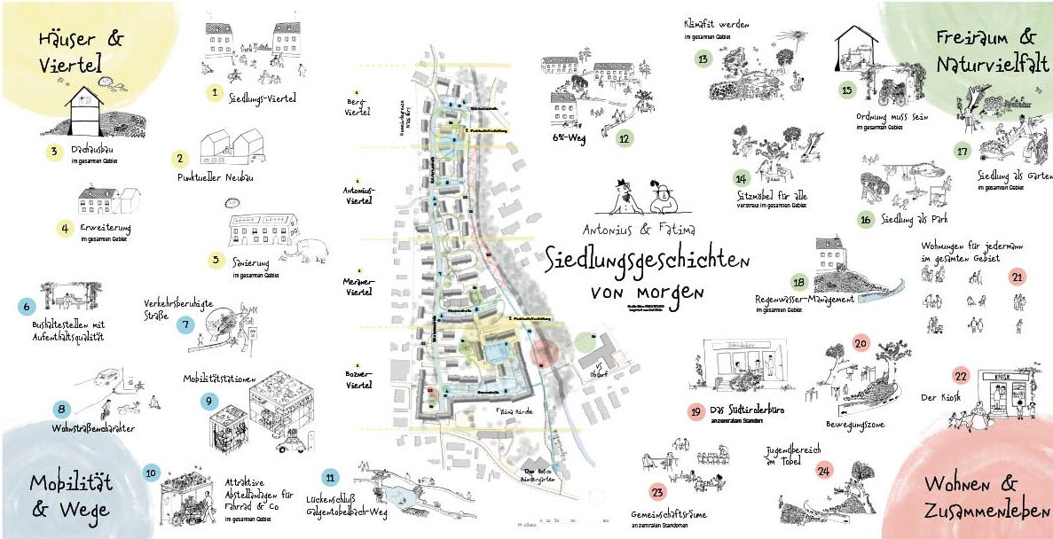 Im Rahmen der Ergebnispräsentation wurde gezeigt, welche Themen den Bewohnerinnen und Bewohner aktuell und auch zukünftig besonders wichtig sind. Grob beziehen sich diese auf vier Bereiche, nämlich leistbaren Wohnraum für unterschiedliche Bedürfnisse, ein gutes Zusammenleben, den Erhalt des Charakters der Siedlung sowie das Schaffen eines klimafitten Stadtteils. Wie die diesbezüglichen Möglichkeiten in der Südtiroler Siedlung genau aussehen wird in den kommenden Monaten analysiert. „Das Ergebnis des gemeinsamen Überlegungsprozesses ist wirklich beeindruckend und auch sehr inspirierend", berichtet Prokuristin Alexandra Schalegg, Geschäftsstellenleiterin der Alpenländischen in Vorarlberg. Die ersten Ideen werden noch 2023 umgesetzt werden, bis dahin ist die „Siedlungsgeschichte von morgen“ schon für alle Interessierten im Rahmen einer Ausstellung in der Siedlung erkundbar. "Die Bewohnerinnen und Bewohner haben durch ihr aktives Mitwirken beim Projekt 'Antonius & Fatima' einen wertvollen Beitrag zur Steigerung der Attraktivität der Südtiroler Siedlung geleistet – ein erster Rahmenplan ist entstanden. Dafür möchte ich mich bei ihnen und dem Projektteam bedanken", unterstreicht der Bludenzer Bürgermeister Simon Tschann.