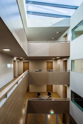 Das größte Objekt der Anlage ist zur Gänze dem betreuten Wohnen vorbehalten und bietet Platz für 30 Haushalte. Mit seiner durchlässigen, gemeinschaftlich nutzbaren Erdgeschosszone ist dieses das Herzstück des Projektes. Wer das Foyer betritt erblickt bereits den grünen Park. Das Atrium sorgt dafür, dass in allen Etagen und öffentlichen Bereichen Naturlicht als Beleuchtung dient. Dieser helle und offene Raum bietet den 30 Parteien eine gemeinsame Kommunikationszone, die auch für Feste und Veranstaltungen genutzt werden kann.