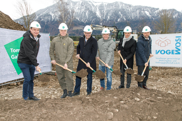 (v.l.n.) Tomaselli GF Philipp Tomaselli, Stv. Kommandant der Walgaukaserne Harald Imlauer, VOGEWOSI-Aufsichtsratsvorsitzender Karlheinz Rüdisser, Bürgermeister Michael Tinkhauser, VOGEWOSI-GF Hans-Peter Lorenz und Landesrat Marco Tittler ©VOGEWOSI