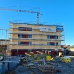 Die Wohnbauselbsthilfe zelebrierte die Dachgleiche bei ihrem Wohnbauprojekt in Lauterach. Hier entstehen 38 geförderte Wohnungen in einem nachhaltigen Wohnhaus. Holz spielt sowohl beim Bau als auch bei der Feier eine wichtige Rolle.