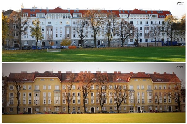 Eindrucksvoller Vergleich: Das Dachgeschoss wurde ausgebaut sowie die Fassade und der Sockel saniert. © GWSG