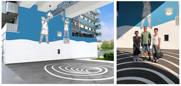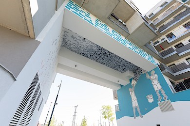 Die Arbeit ruft gekonnt die immense Bedeutung städtischer Infrastrukturen ins Bewusstsein, die nicht selten verborgen bleiben und doch so zuverlässig einen reibungslosen Alltag ermöglichen. Moussa Kones Gestaltung bleibt dabei leicht und fast verspielt und wird zu einem identitätsstiftenden Element der EBG-Wohnhausanlage, dass für die Bewohnerinnen und Bewohner sowie alle Betrachterinnen und Betrachter eine einladende optische Darstellung bietet und zugleich auf eine spannende und wichtige Geschichte Wiens hinweist.