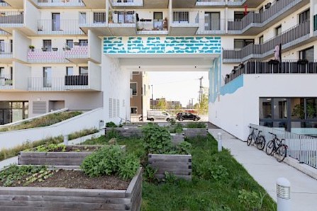 Eine Besonderheit des Projekts stellt nicht nur das neue Kunstprojekt dar, sondern ist auch die bauliche Gestaltung. Gemäß den Vorgaben leistbares Wohnen in zentraler Lage mit guter Anbindung und dennoch ausreichend Frei- und Grünraum zu schaffen, verlängert das Bauprojekt den angrenzenden Park visuell und den klassischen Wohnhof neu interpretiert. Dies wird beispielsweise mit großzügigen Gemeinschaftsflächen wie dem Gemeinschaftsraum, Gartenpavillon und anschließendem Grillplatz erreicht.