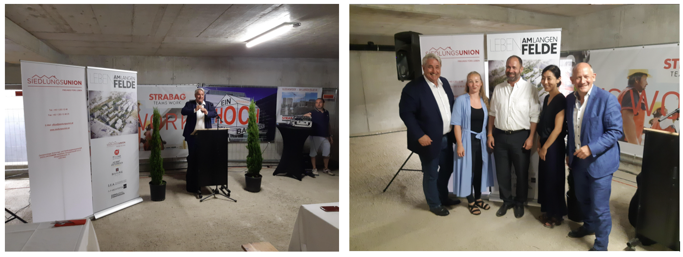 Im Rahmen dieses großen Bauprojekts der SIEDLUNGSUNION entsteht eine Wohnhausanlage mit insgesamt 253 Wohneinheiten. Anlässlich des beeindruckenden Baufortschritts wurde eine Gleichenfeier veranstaltet. Mit dabei war – als besonderer Ehrengast –d er Bezirksvorsteher Ernst Nevrivy. Auch Oliver Vollgruber von der SIEDLUNGSUNION beehrte das Fest. Um nicht nur den Bau wunderbarer neuer Wohnungen sicherzustellen, sondern auch das Glück der zukünftigen Bewohnerinnen und Bewohner, durfte eine bestimmte Sache nicht fehlen: Der Brauch eines Gleichenspruchs mit dem Zerschellen eines Glases. Im Rahmen dessen ist der Dank an das gesamte Team zum Ausdruck gebracht worden. Ein kleiner Auszug des Spruchs lautete unter anderen wie folgt: „Unser Baustöllnteam bringt des alles net in Not, weil a jeder statt Nerven Drohtseil hot. Die Zusammenorbeit wor ausgsprochen guat, I ziag vor OLLE, die do sitzn mein – Huat“.