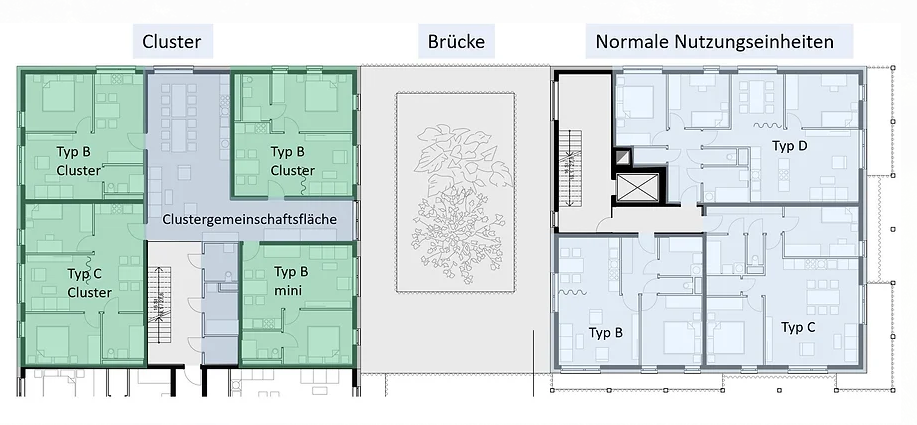 Beim Clusterwohnen können Menschen, mit gemeinsamen Lebensrhythmen wie zum Beispiel Alleinerzieherinnen und Alleinerzieher, Seniorinnen und Senioren, Familien oder Studentinnen und Studenten kommunikativ wohnen, haben aber dennoch eine für sich funktionierende Nutzungseinheit als privaten Rückzugsraum. Diese Clustereinheiten sind kleiner gestaltet und haben beispielsweise kleinere Zimmer, keine Balkone oder kein getrenntes Bad und WC, sind jedoch deutlich günstiger und es stehen dafür rund 120 m² Gemeinschaftsfläche (große Gemeinschaftsküche, Gemeinschaftsbad mit Badewanne, großer Abstellraum) zur Verfügung.