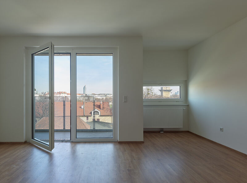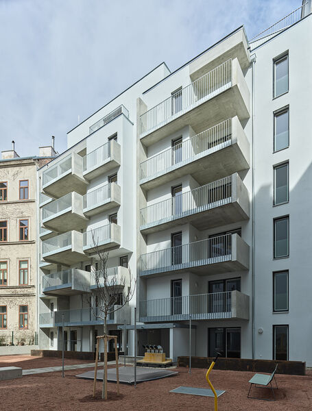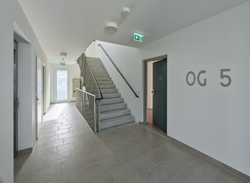 Neben privaten Räumlichkeiten wie Schlaf- und Wohnzimmern sowie Sanitäranlagen in den jeweiligen Wohnungen, die zudem auch über Freiflächen wie Loggien, Balkonen und Terrassen verfügen, gibt es Gemeinschaftseinrichtungen. Im Erdgeschoß befindet sich ein überdachter Fahrradabstellbereich und zwei Kinderwagenabstellräume, im Dachgeschoß eine Waschküche mit einer Waschmaschine, einem Trockner und einem Waschbecken. Ebenfalls am Dachgeschoß situiert gibt es eine gemeinschaftliche Dachterrasse sowie ein behindertengerechtes WC. Die PKWs der Bewohnerinnen und Bewohner können sicher in der Tiefgarage des Wohnhauses geparkt werden, die sich im Kellergeschoß befindet und Platz für 32 Autos hat.