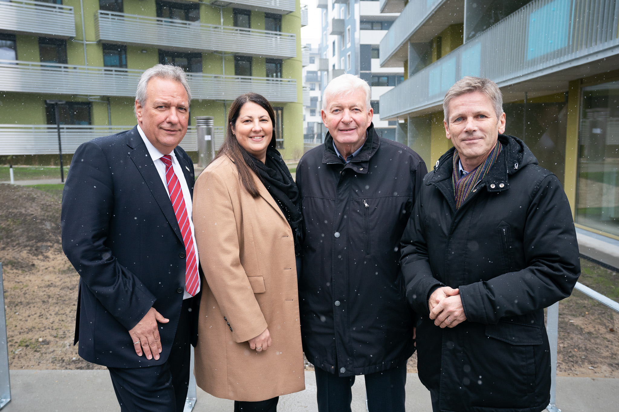 vlnr.: Michael Gehbauer (Geschäftsführer WBV GPA), Kathrin Gaal (Wohnbaustadträtin), Willi Zechner (ehem. Vorstand SOZIALBAU AG), Josef Ostermayer (Generaldirektor SOZIALBAU AG) Fotocredit: David Bohmann / PID