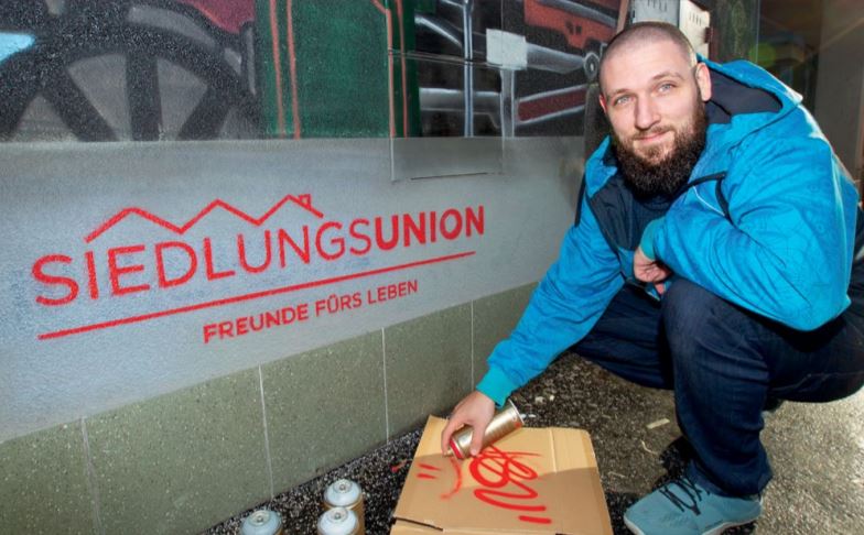 Schmierereien an Hausfassaden sind ein alltägliches und kostspieliges Problem für Bauträger. Die Siedlungsunion konnte nun mit einem neuen Ansatz überzeugen: Eine Kooperation mit dem bekannten Graffit-Sprayer Noskool, auch bekannt als Stefan Fenzel, zeigte vollen Erfolg. In der Stadlauer Straße entstand an einer Wohnanlage der Siedlungsunion in Wien Floridsdorf ein besonderes Kunstwerk: Ein riesiges Abbild einer Szenerie eines Bahnhofs wurde erschaffen und erinnerte somit an die Geschichte der Stadlauer Straße mit dem Bahnhof Stadlau: „Das Motiv erinnert an die Geschichte dieses Ortes als Knotenpunkt des Schienenverkehrs. Das Haus bleibt, wo es ist, aber wir reisen zurück in der Zeit“, so Fenzel zu seinem Motiv.